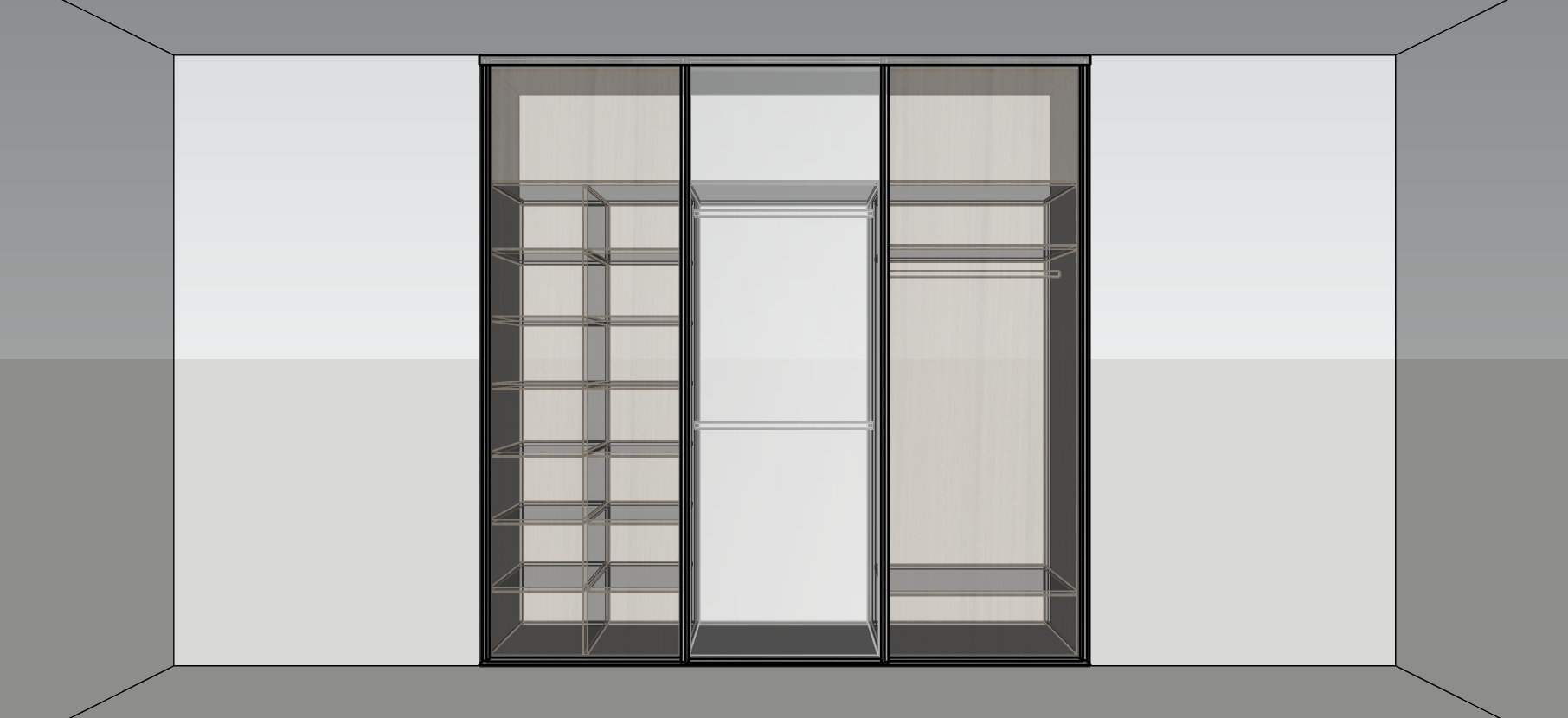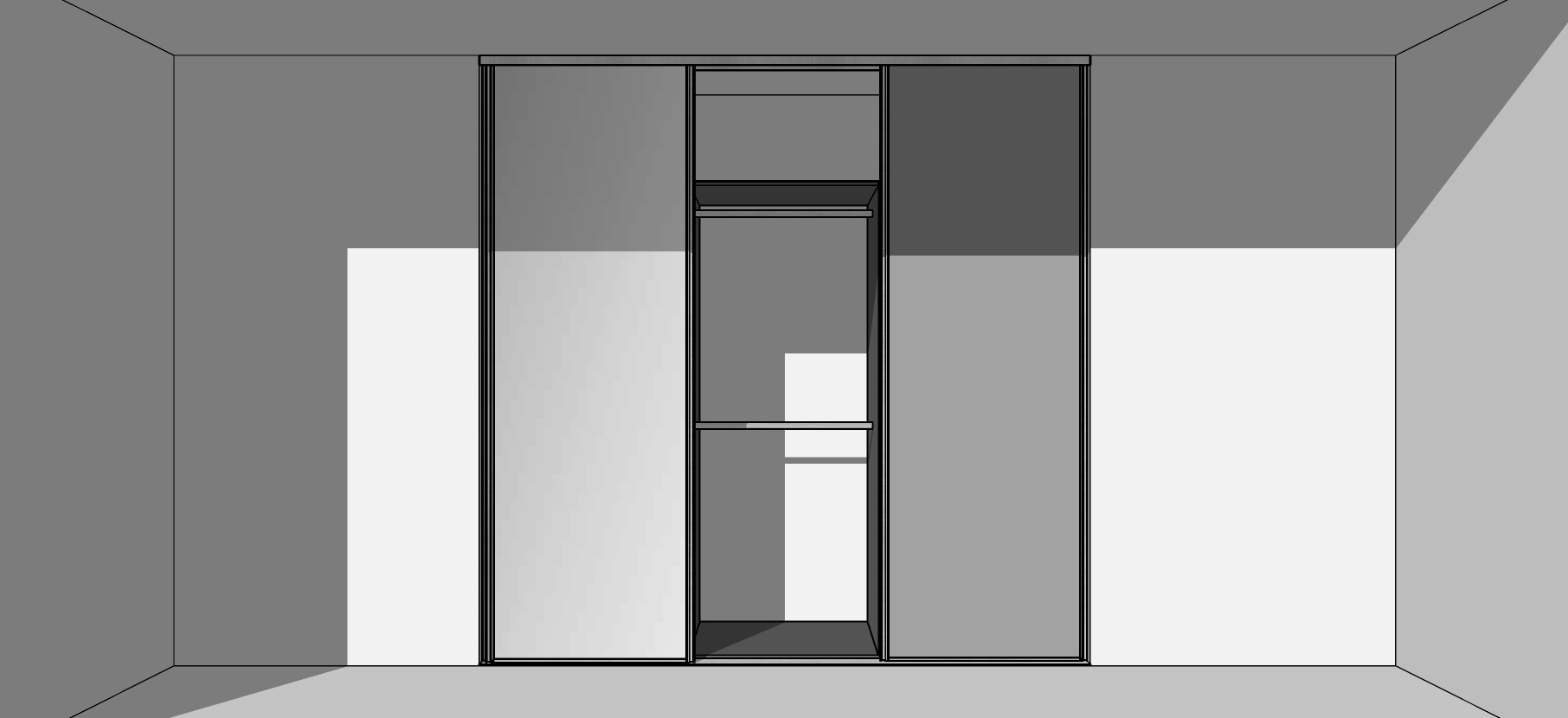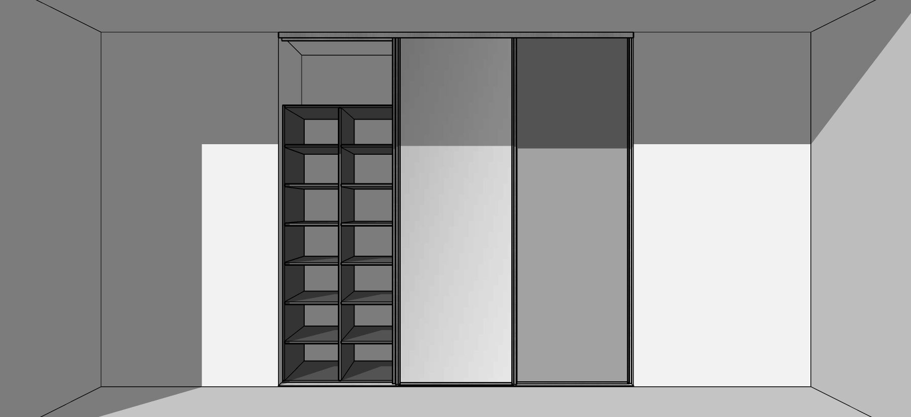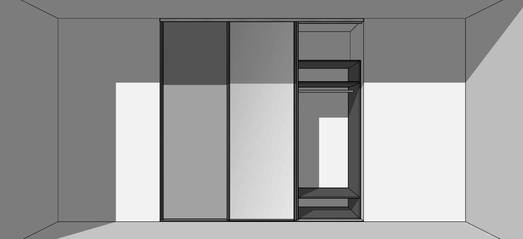 - Bīdāmo durvju komplekts ar trīs vērtnēm, vadotnēm, rullīšiem un fiksatoriem. Viena no vērtnēm spogulis, divas lamināts