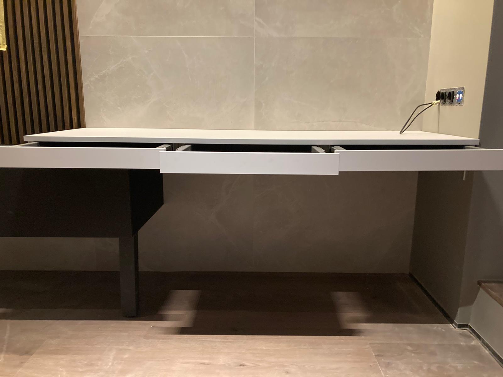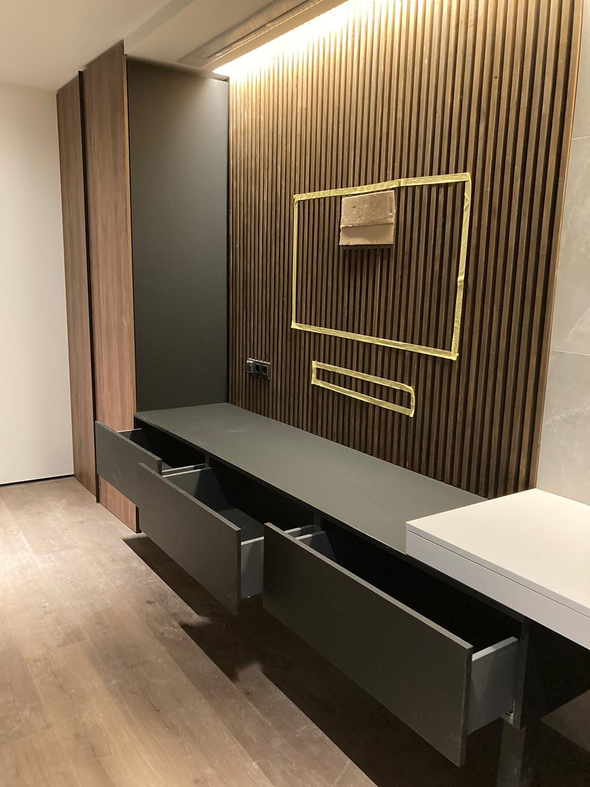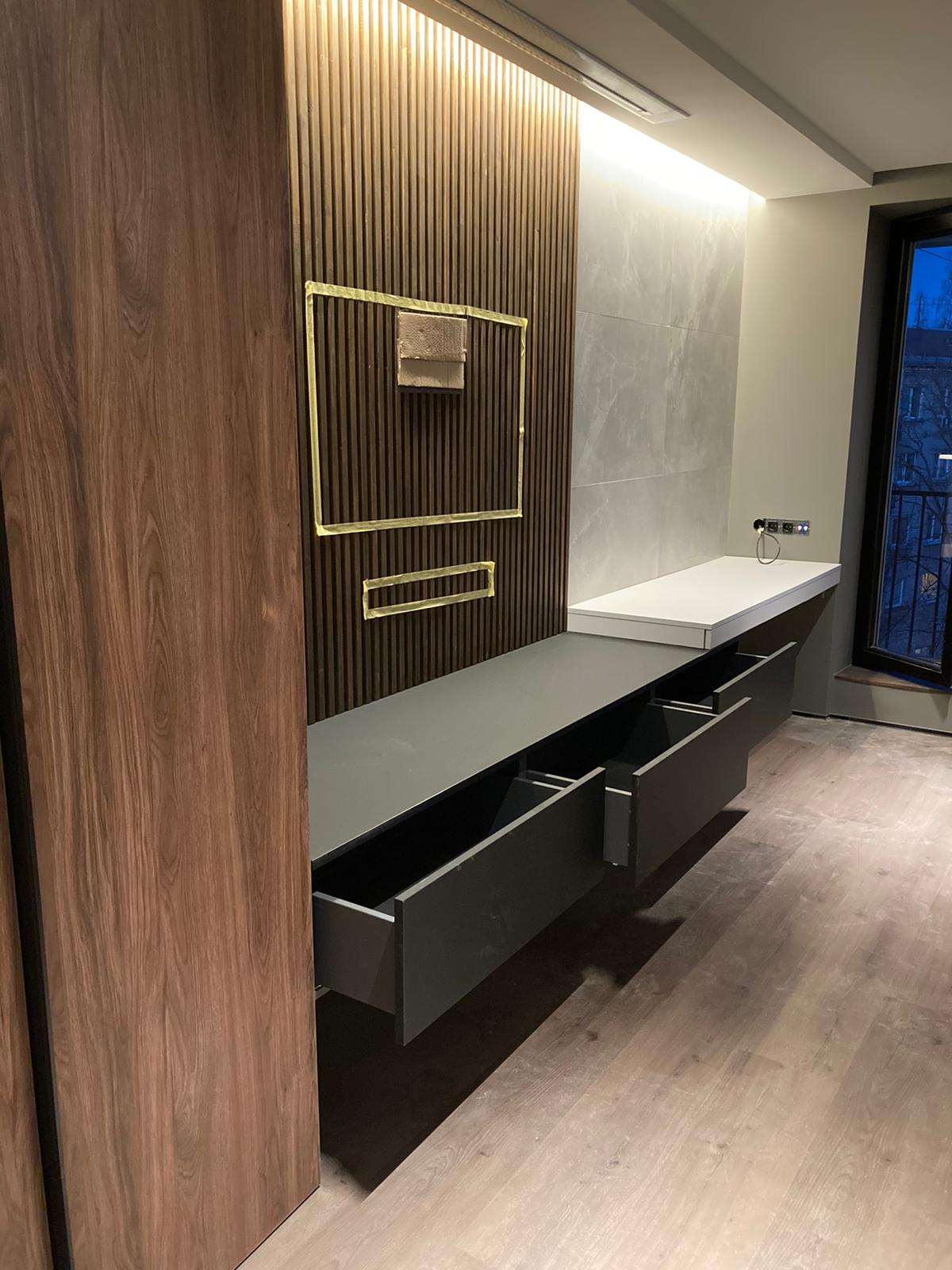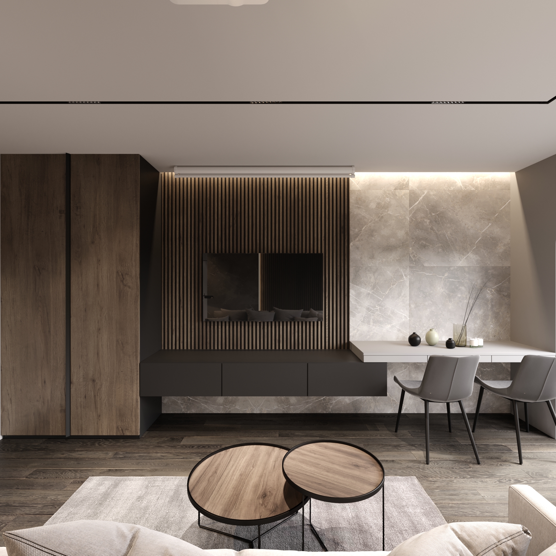 Mūsdienās arvien vairāk cilvēki strādā no mājām. Dzīvokļos ne vienmēr ir pieejama atsevišķa darba telpa. Šajā projektā radījām universālu mēbeļu iekārtu, kas lieliski iederas viesistabā. Istabas centrā kumode ar 3 atvilktnēm virs kuras dekoratīvo paneļu siena. Pa kreisi liels un ietilpīgs skapis drēbēm un mantu glabāšnai. Un telpas labajā pusē darba galds ar 3 atvilktnēm. Darba galds arī izvietots blakus sienai ar logu, tā iegūstot papildu gaismu strādāšanai. Projektā izmantoti premium materiāli, piemēram, FENIX plātnes ir atzītas kā vienas no izturīgākajām pasaulē. Tām piemīt īpaši matēta un gluda tekstūra. Malas aplīmē tikai ar Airtech tehnoloģiju, kas nodrošina kvalitāti ilgtermiņā.