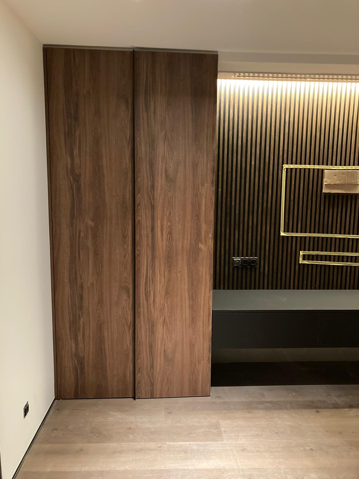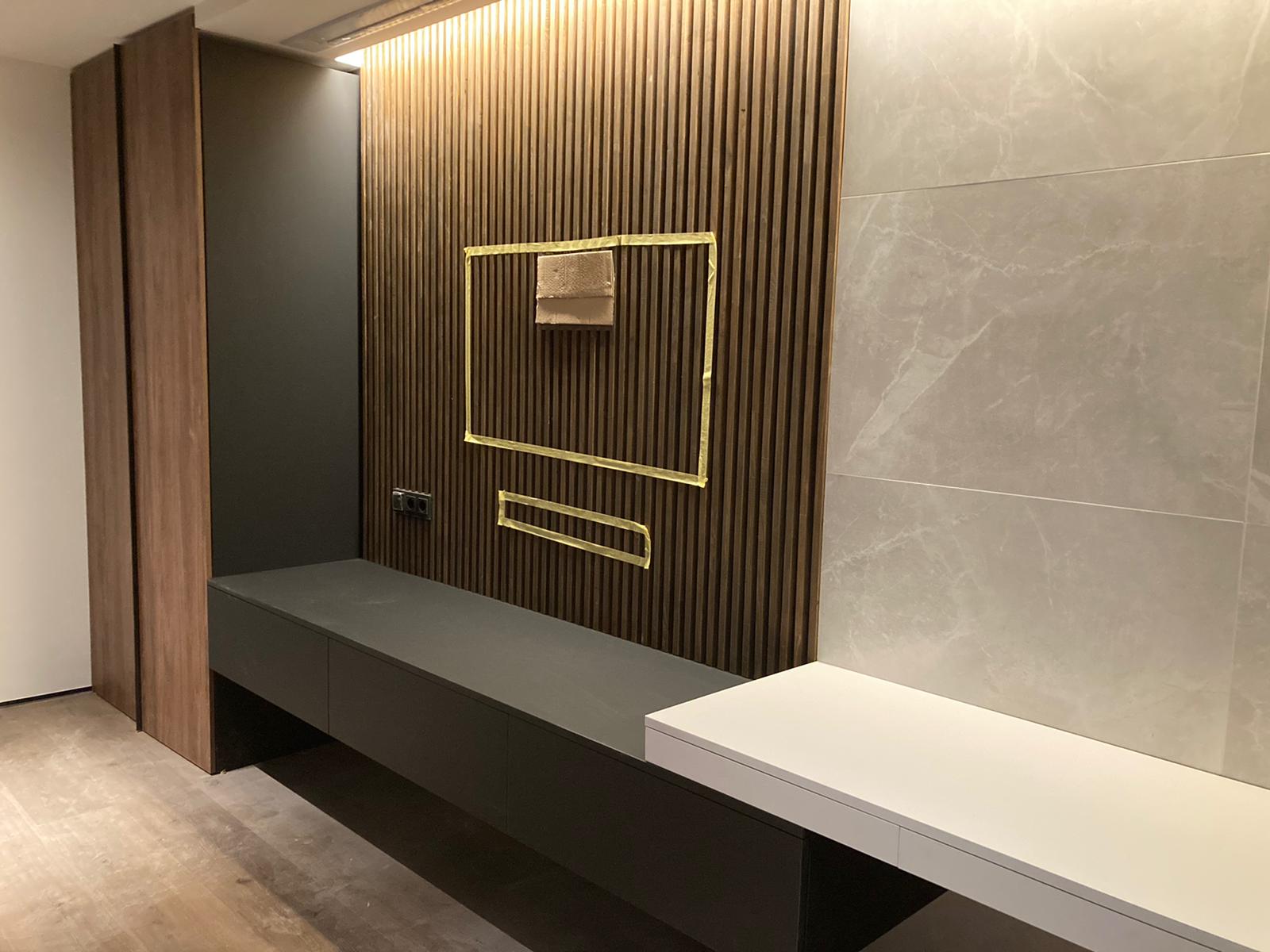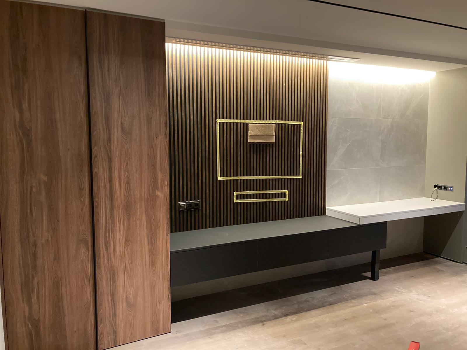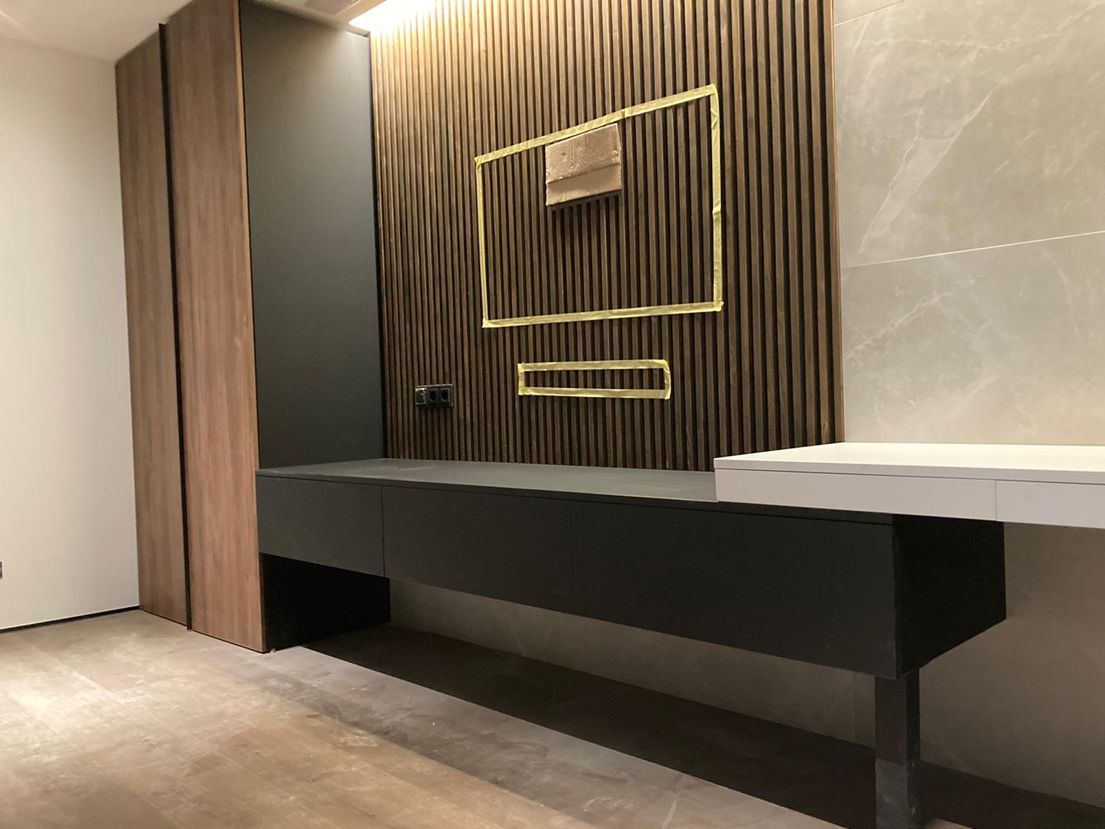 Mūsdienās arvien vairāk cilvēki strādā no mājām. Dzīvokļos ne vienmēr ir pieejama atsevišķa darba telpa. Šajā projektā radījām universālu mēbeļu iekārtu, kas lieliski iederas viesistabā. Istabas centrā kumode ar 3 atvilktnēm virs kuras dekoratīvo paneļu siena. Pa kreisi liels un ietilpīgs skapis drēbēm un mantu glabāšnai. Un telpas labajā pusē darba galds ar 3 atvilktnēm. Darba galds arī izvietots blakus sienai ar logu, tā iegūstot papildu gaismu strādāšanai. Projektā izmantoti premium materiāli, piemēram, FENIX plātnes ir atzītas kā vienas no izturīgākajām pasaulē. Tām piemīt īpaši matēta un gluda tekstūra. Malas aplīmē tikai ar Airtech tehnoloģiju, kas nodrošina kvalitāti ilgtermiņā.