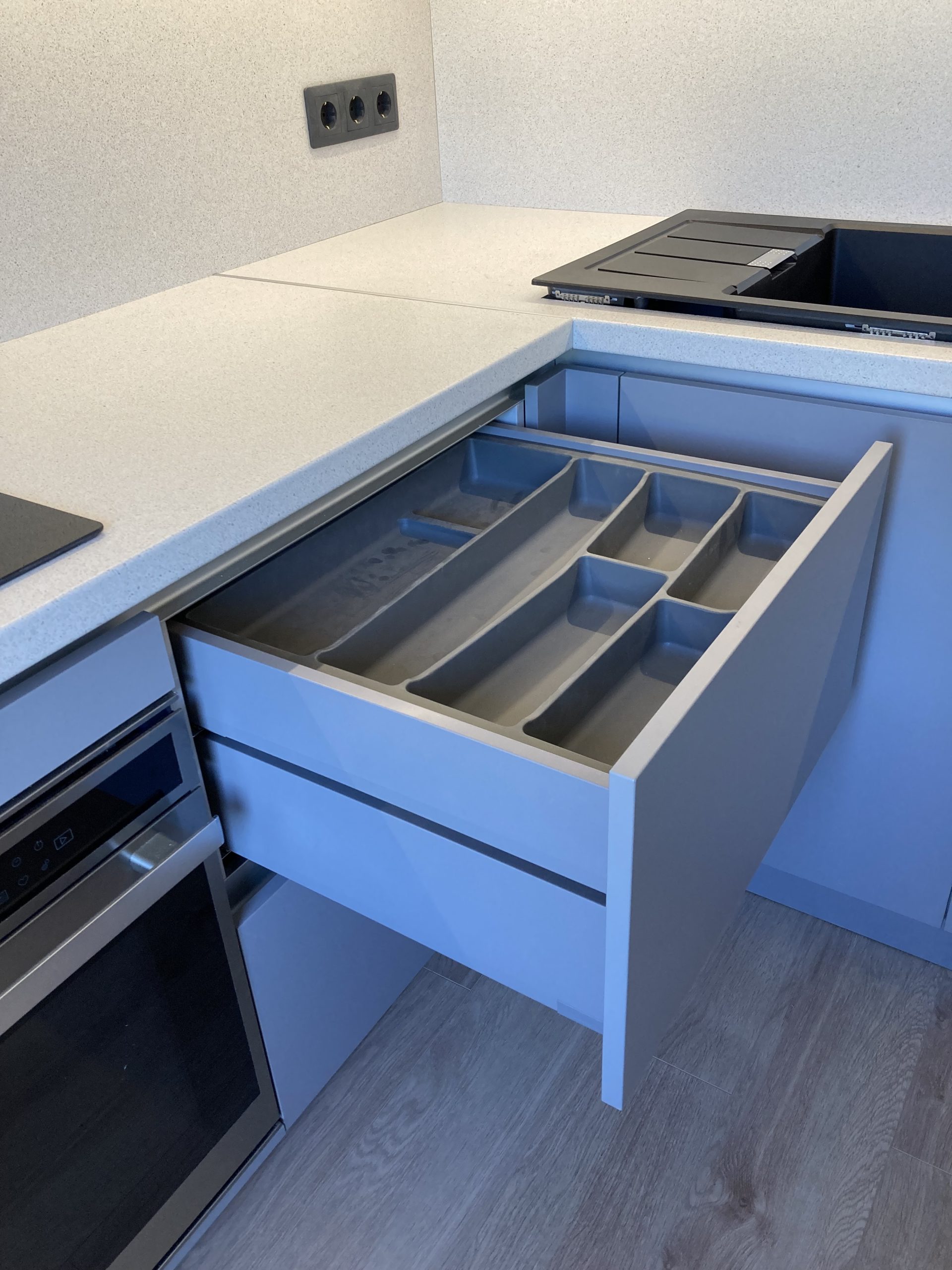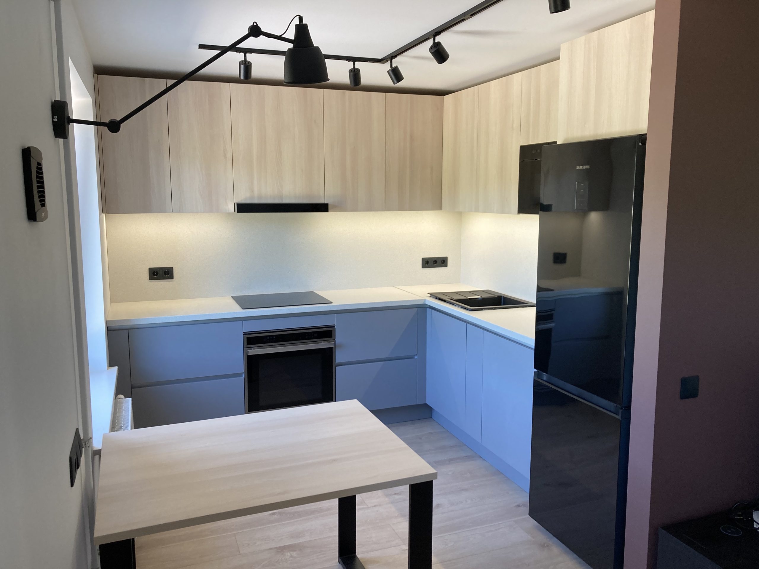 Elegants un vienkāršs ēdamgalds noteikti nepieciešams katrā virtuvē. Šajā projektā izmantota metāla konstrukcija. Galda virsma ēdamgaldam sakrīt ar sienas skapju fasādēm. Galda kāju konstrukcija no metāla, krāsota melnā krāsā. Lampas, rozetes, ledusskapis, izlietne, plīts virsma un citi elementi veiksmīgi veido melnās krāsas akcentus telpā. Baltā galda virsma ar sienas paneli rada lielisku pāreju uz pelēko grīdas skapju toni. Šis mēbeļu projekts pierāda, ka izvēloties sadarbību ar pieredzējušu dizaineri, atmaksājas.