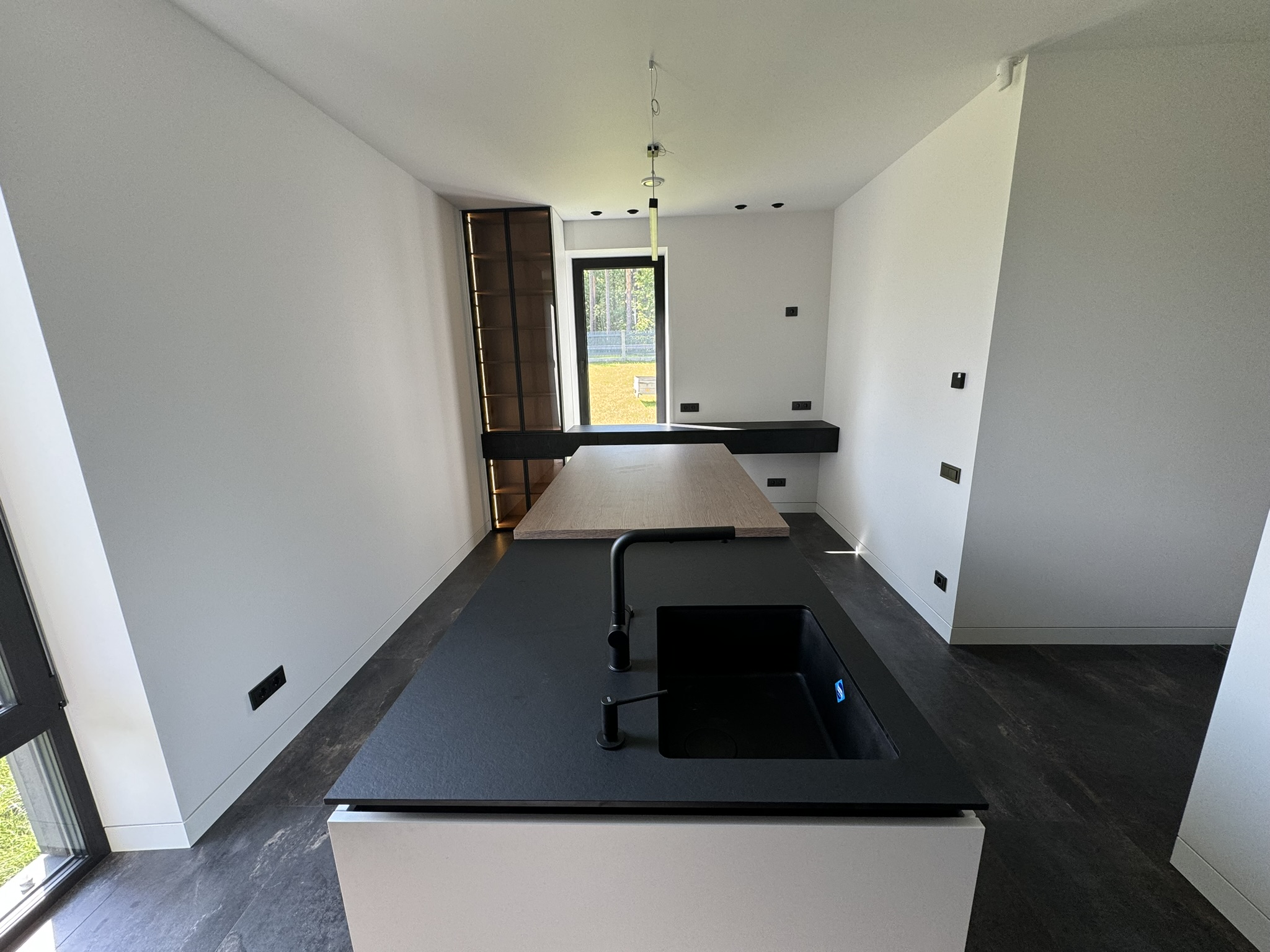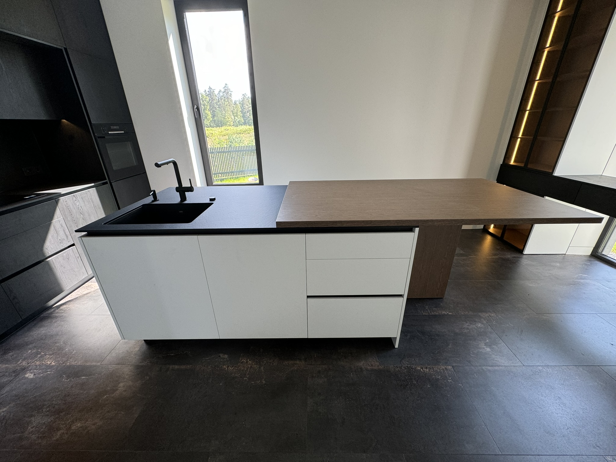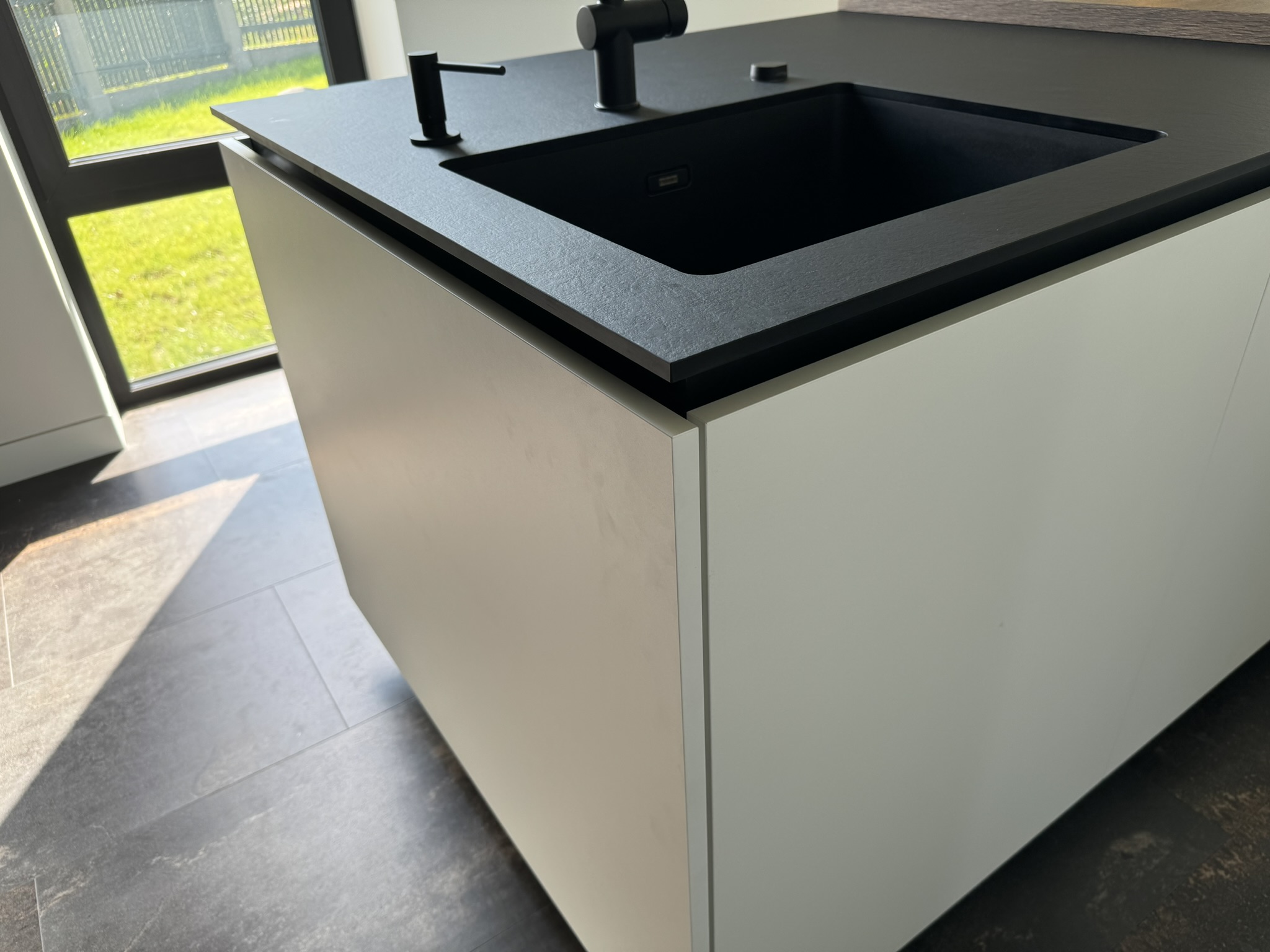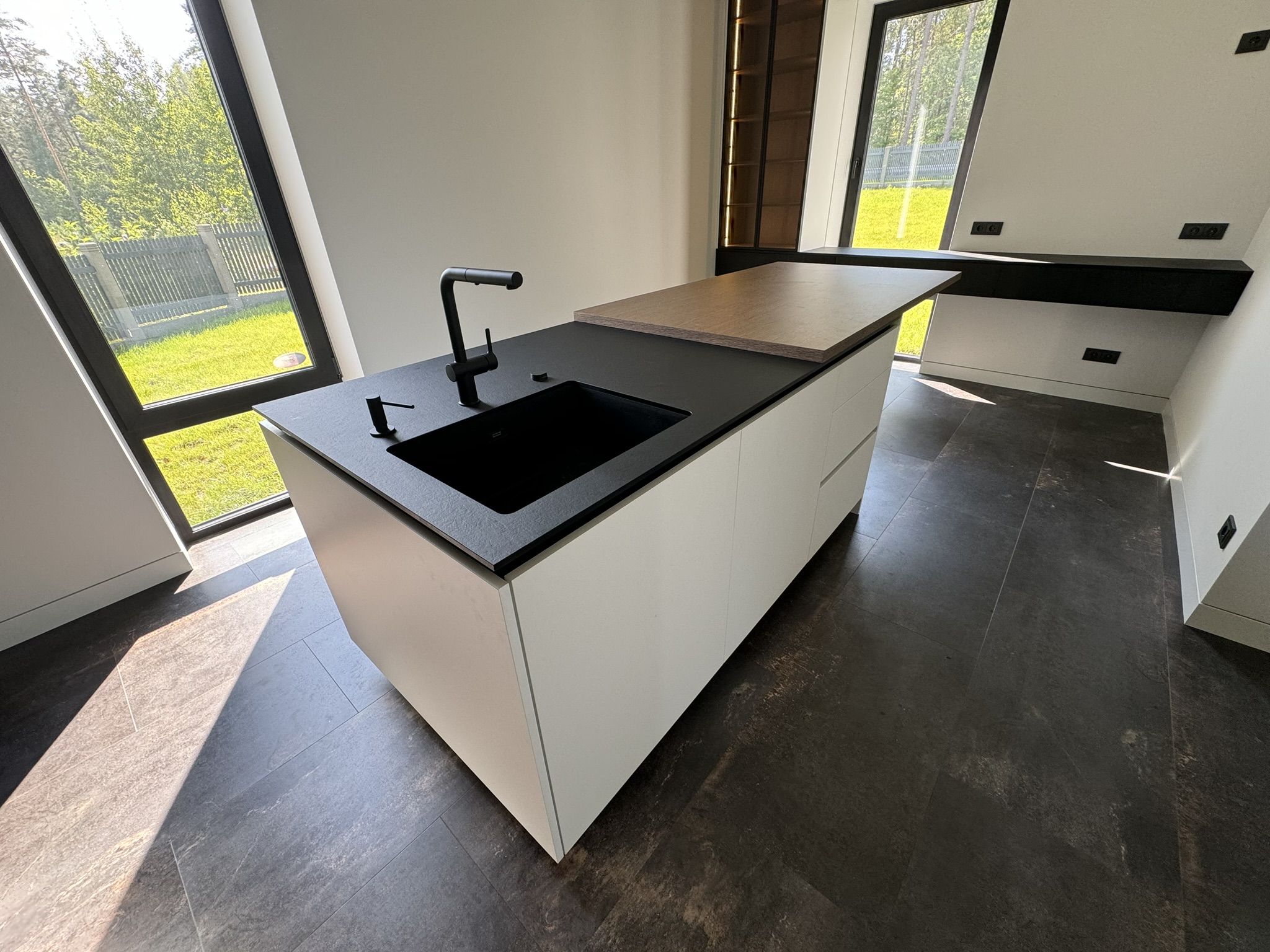 - Melnā galda virsma un sienas panelis kompaktlamināts no FUNDERMAX, HPL 0080 SX/FH, 12 mm biezumā, akmens tekstūra. Šo materiālu var izmantot arī āra mēbelēm, eksterjeram. Pabūvēta izlietne no FRANKE. Jaucējkrāns un ziepju dozators arī no FRANKE.