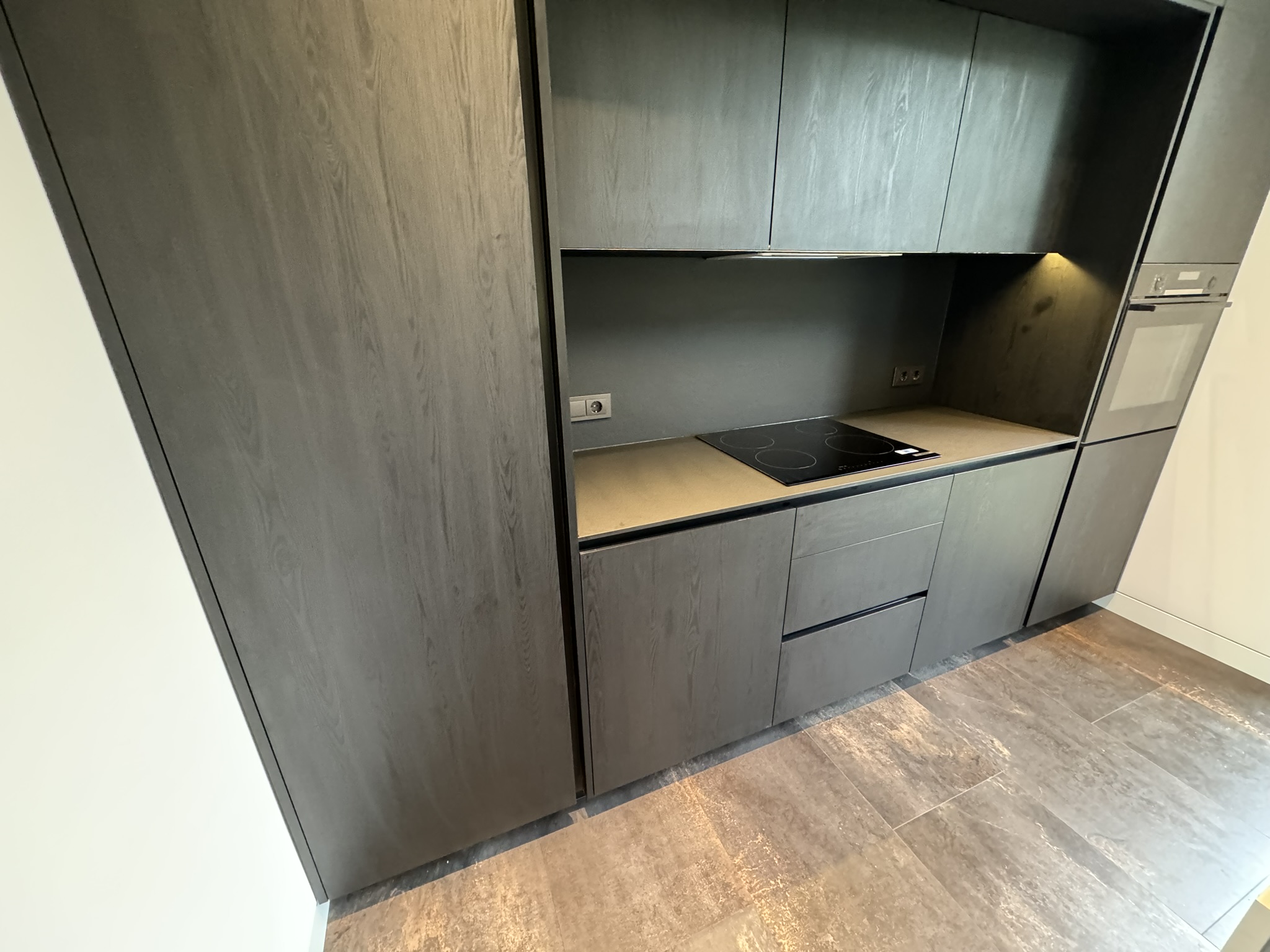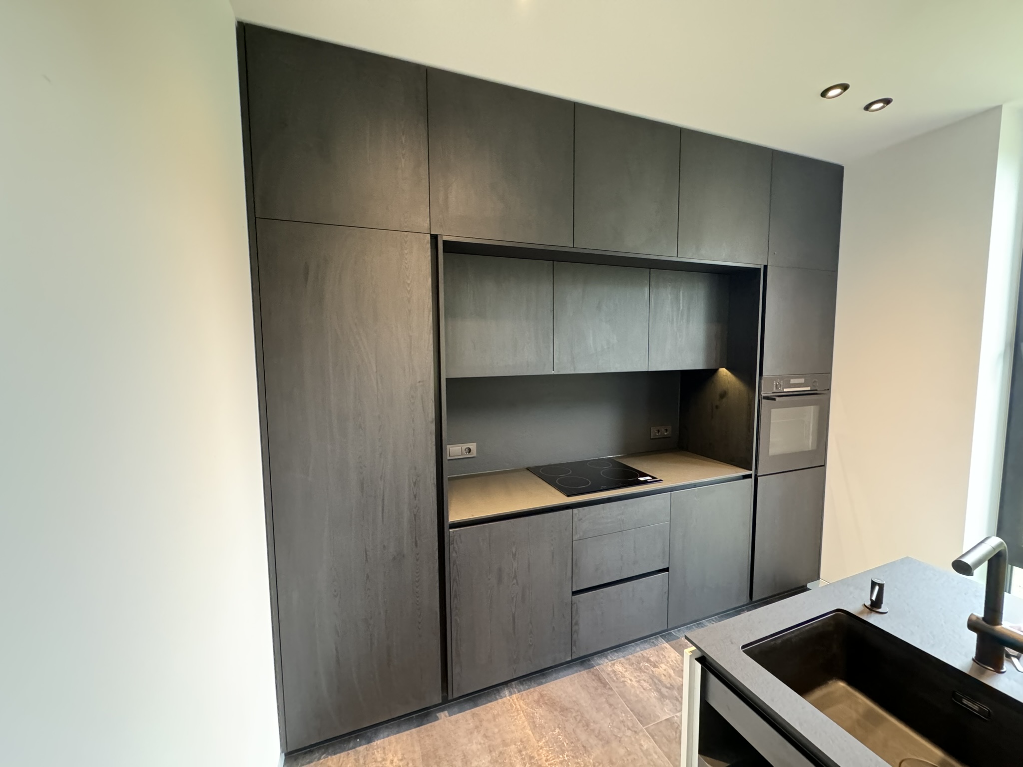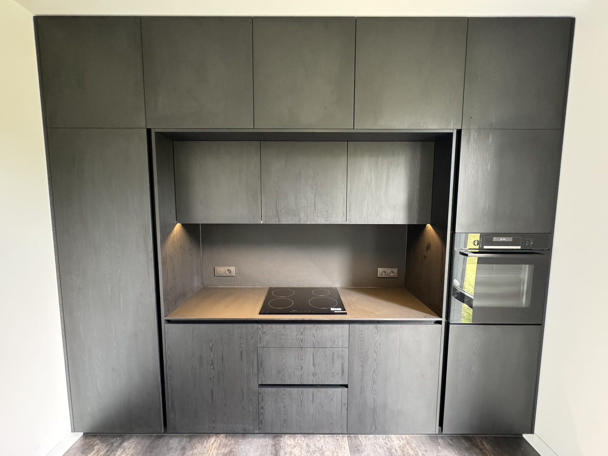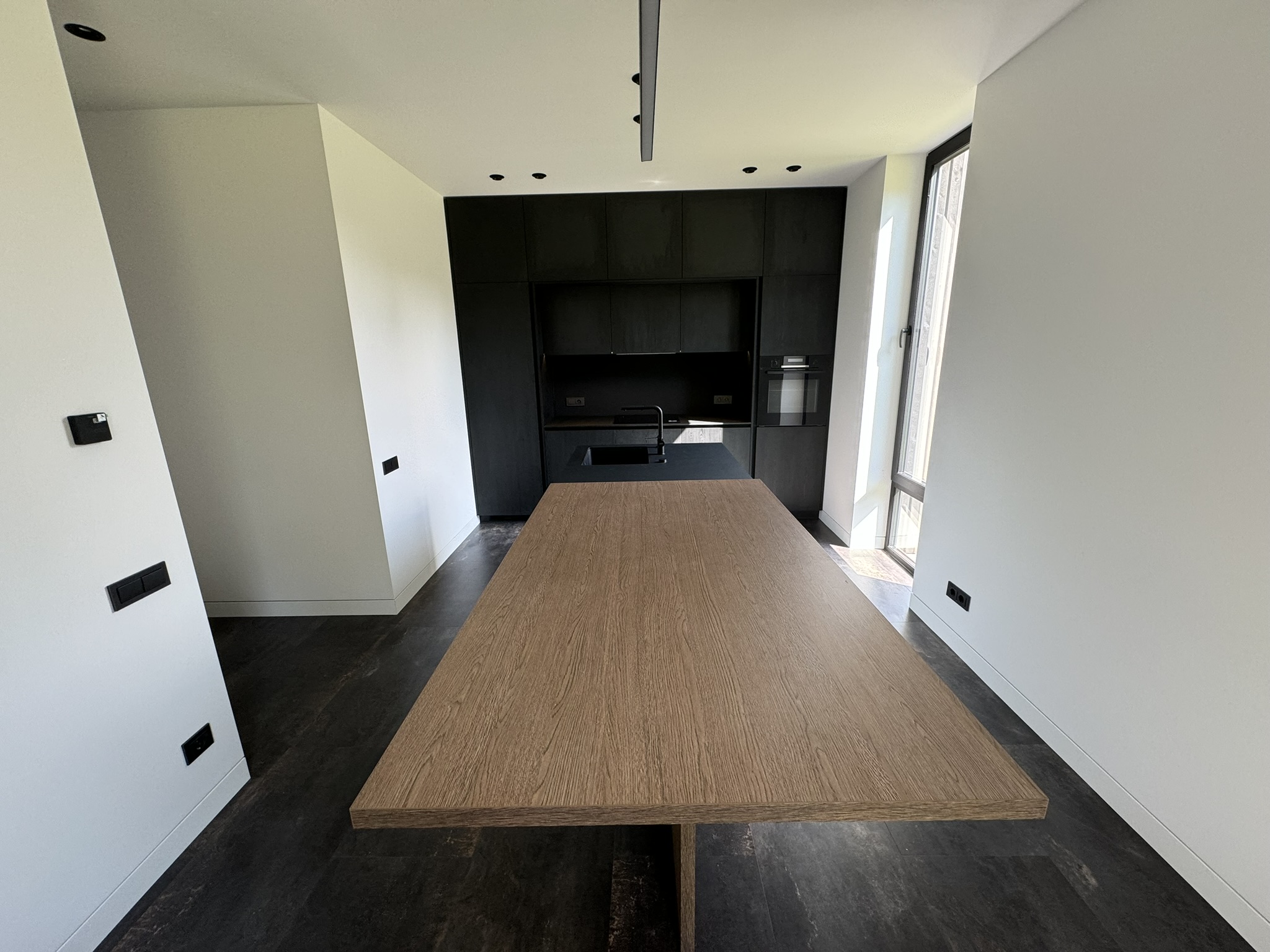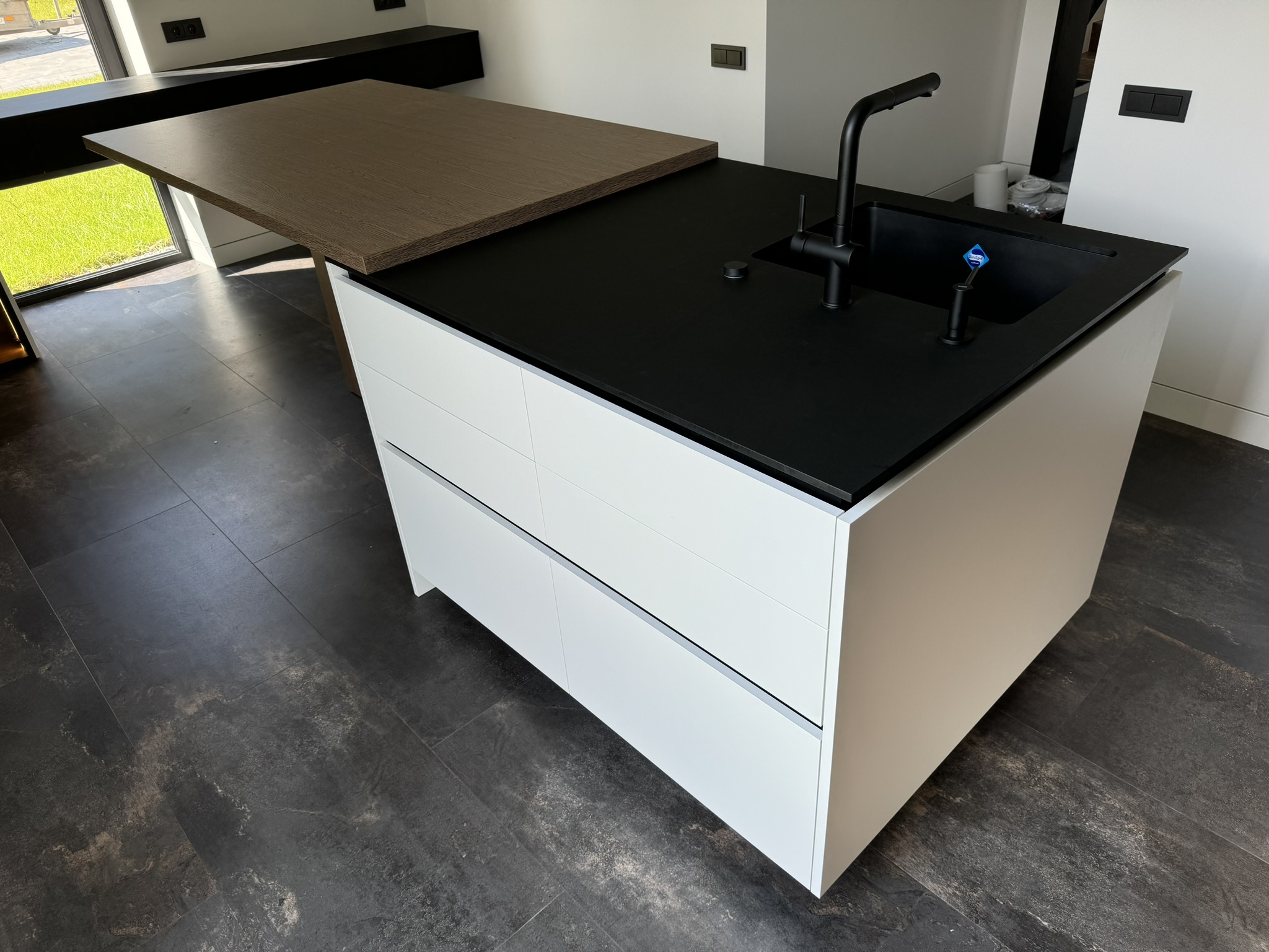 - Melnā galda virsma un sienas panelis kompaktlamināts no FUNDERMAX, HPL 0080 SX/FH, 12 mm biezumā, akmens tekstūra. Šo materiālu var izmantot arī āra mēbelēm, eksterjeram. Pabūvēta izlietne no FRANKE. Jaucējkrāns un ziepju dozators arī no FRANKE.